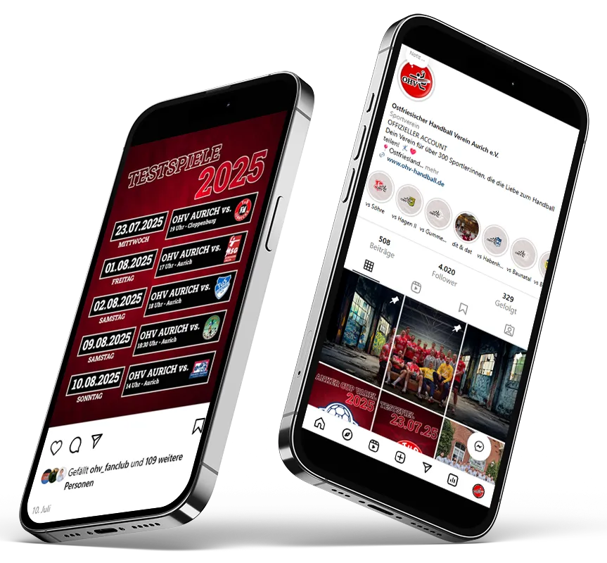 Um Fans, Spieler und Sponsoren besser zu erreichen, haben wir die Social Media Kanäle des OHV Aurich komplett neu aufgestellt. Von Instagram über Facebook bis hin zu digitalen Kampagnen haben wir eine frische visuelle Linie geschaffen und Inhalte entwickelt, die begeistern und binden. Mit klarem Design, starkem Content und einer Strategie, die funktioniert, sorgen wir für mehr Interaktion und Reichweite – authentisch, nahbar und zielgerichtet.